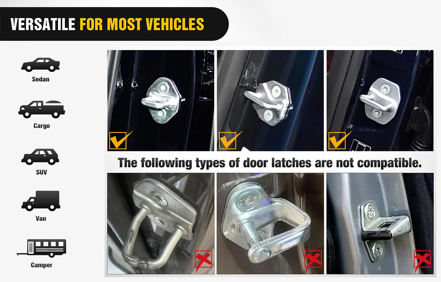 It fits most cars, SUVs, and trucks with standard door latches. Please double-check your vehicle’s latch structure before use to ensure a secure fit.