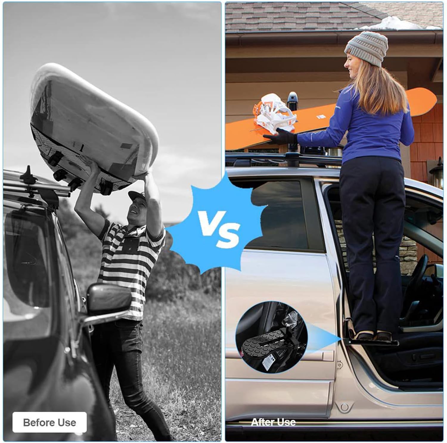 This vehicle door step is designed for most SUVs and trucks. It easily hooks onto the car door latch at the right angle and works on both front and rear doors, giving you quick car roof access anywhere you need it.