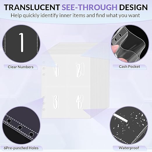 See-through pages + clear numbering let you find cash fast. 6 pre-punched holes fit the binder; waterproof material keeps contents safe—practical and convenient.