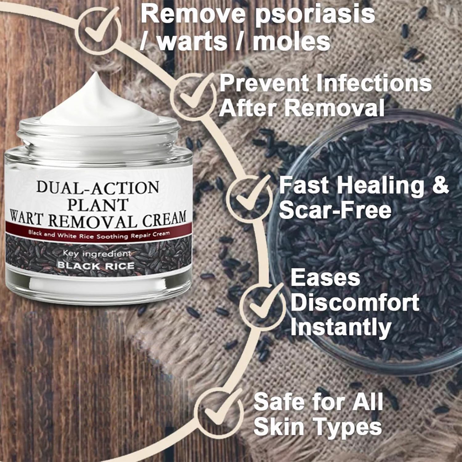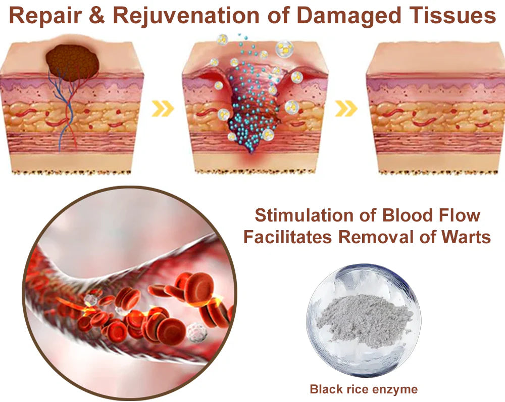Black rice enzyme regulates abnormal skin cells: it boosts metabolism of overgrown keratinocytes, induces their natural breakdown (apoptosis), and gently dissolves wart tissue. This causes warts/skin tags to shrink, dry up, and fall off naturally—without damaging healthy skin.