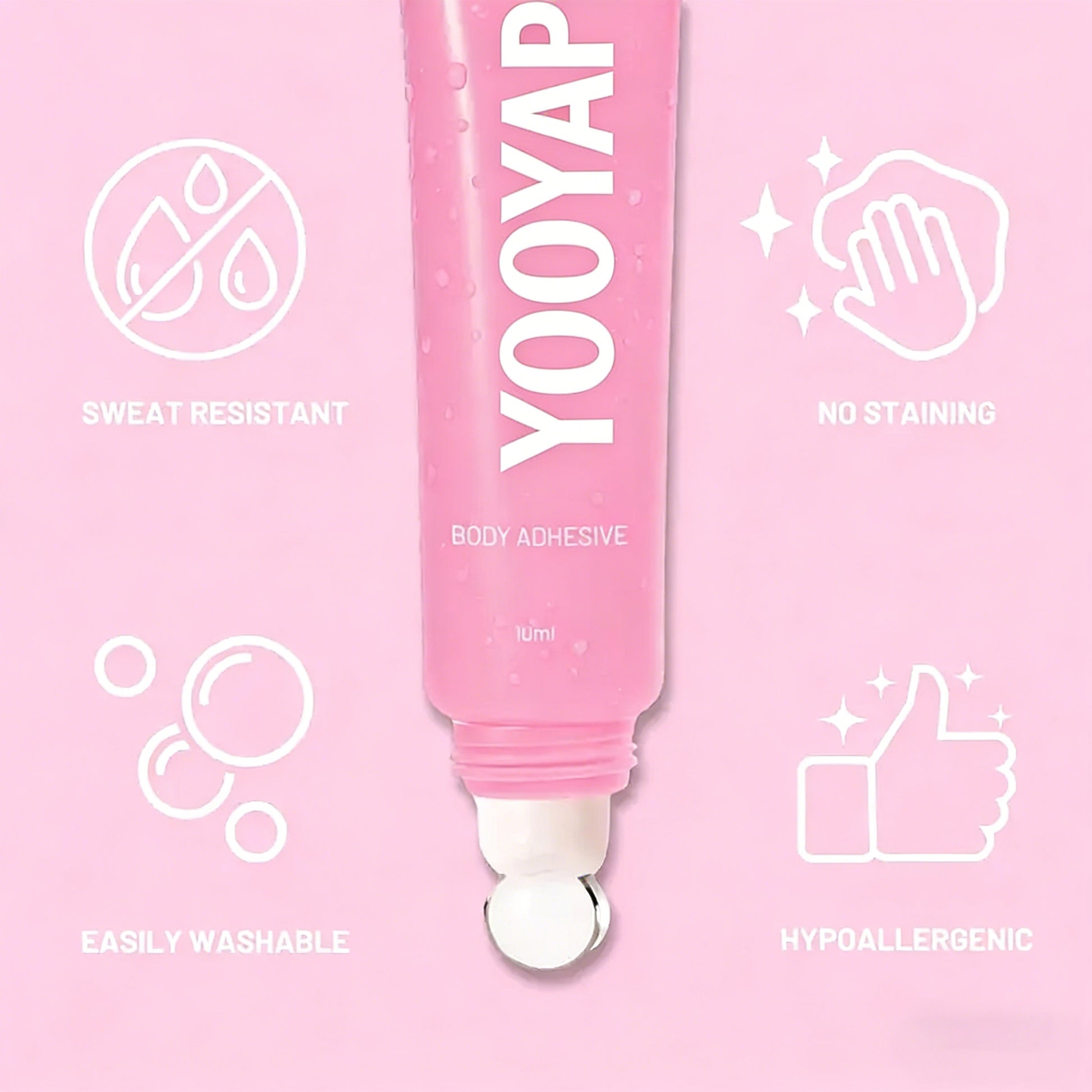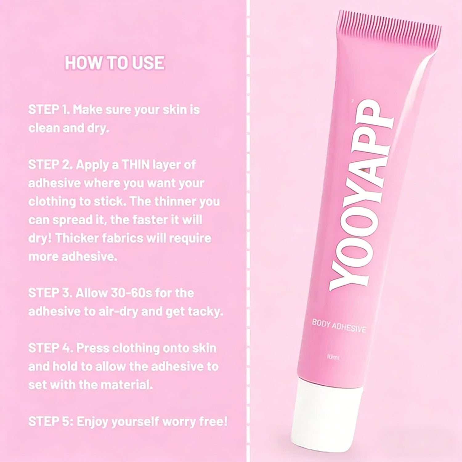 This fast-drying, skin-friendly liquid adhesive keeps clothes in place through sweat/dance—easy to apply, simple to remove (soap + water), and safe for sensitive skin.