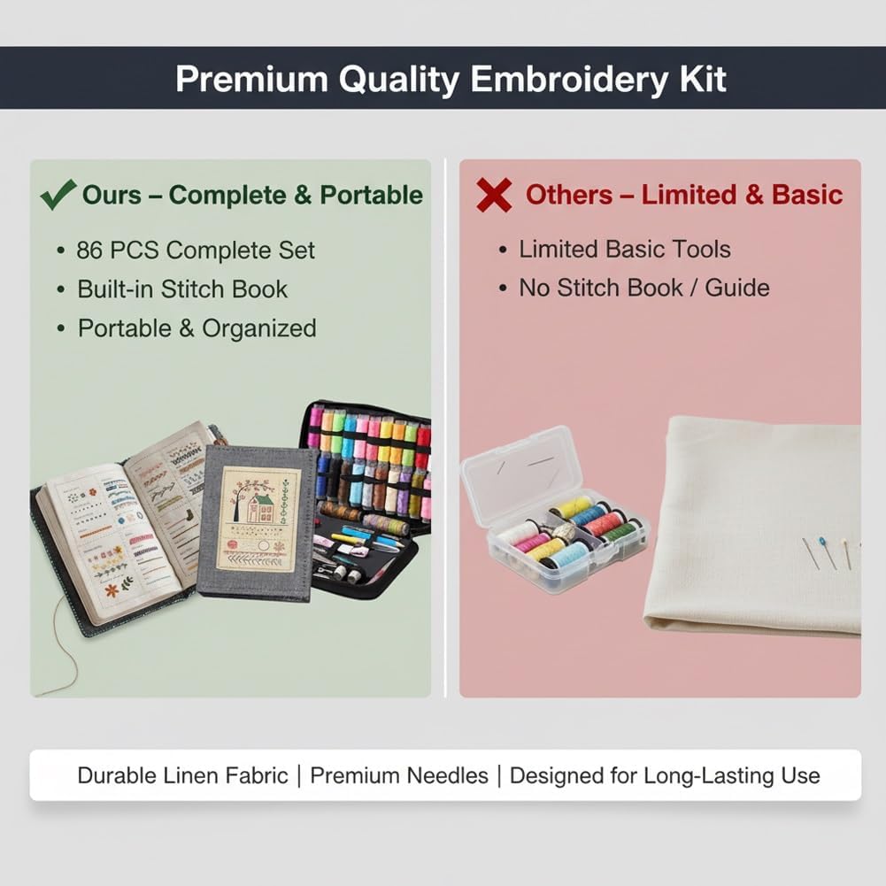 Compare and see—our kit packs 86 complete tools + a built-in stitch book (perfect for beginners!), all in a portable, organized case. Others only offer basic supplies with no guidance. Ours also uses durable linen fabric and premium needles for long-lasting use.