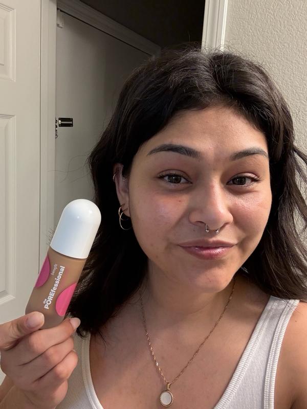 Left: Visible pores and shine. Right: Instantly blurred, smooth skin with The Porefessional Foundation—no filter, just a lightweight matte formula that erases imperfections for a natural, flawless finish. 🌟 Results shown on shade H4, skin unretouched.