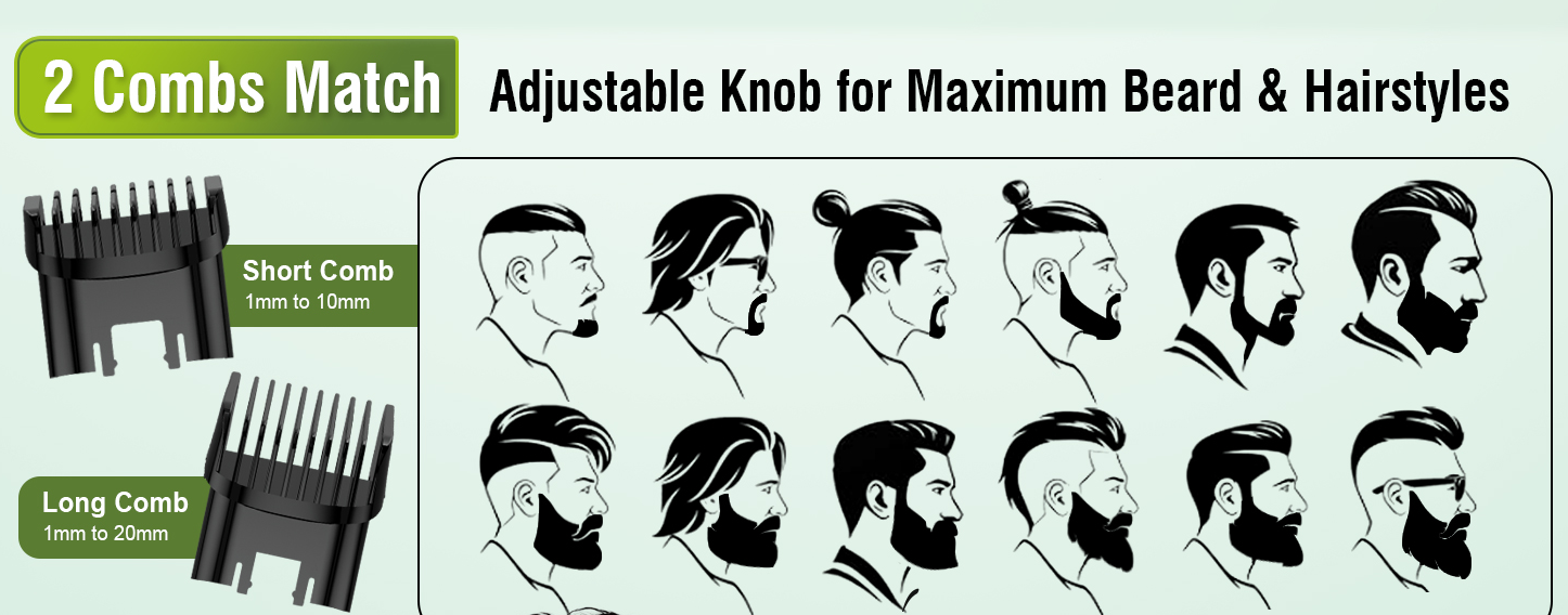Design more styles with our electric beard trimmer for men, complete with two hair combs. Achieve 20 different trimming lengths effortlessly through knob calibration, allowing you to customize your look for your beard, chin, sideburns, etc. Experience simple operation and design versatility.Remove off the hair comb will allow for a more thorough trim