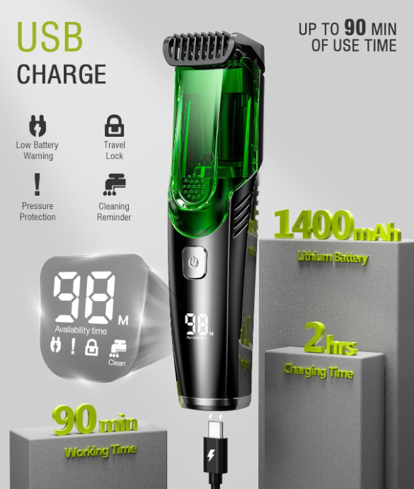 Experience a mess-free grooming routine with our Vacuum Beard trimmer for men. Our built-in super suction vacuum trimmer effortlessly captures trimmed hair in an internal compartment for easy disposal and cleaning. Say goodbye to scattered beard on your sink and floors.