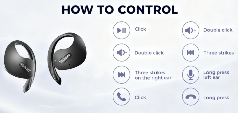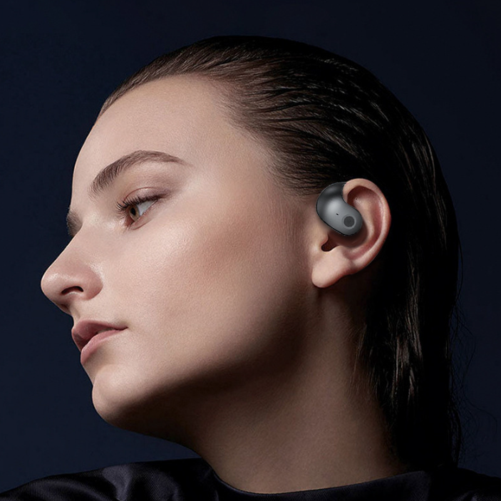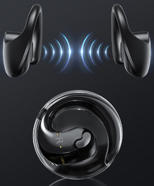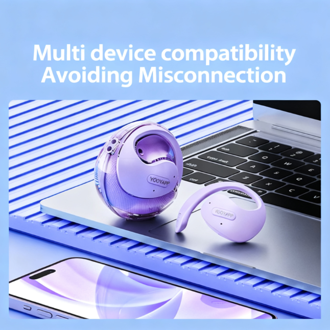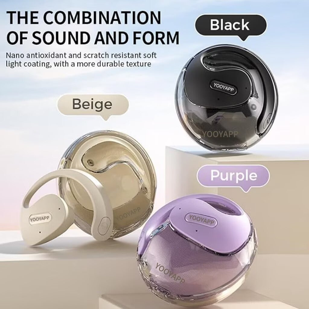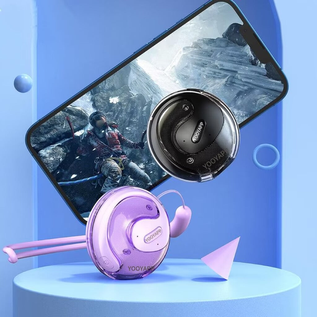 The YOOYAPP features an open-ear design with ear hooks for secure and comfortable wear. Gently place the earbud over your ear, ensuring the hook rests comfortably behind your ear. The speaker should be positioned near your ear canal without entering it, allowing for ambient sound awareness.